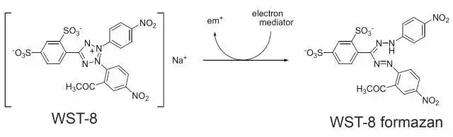 基本原理为:该试剂中含有WST-8【化学名:2-(2-甲氧基-4-硝基苯基)-3-(4-硝基苯基)-5-(2,4-二磺酸苯)-2H-四唑单钠盐】,它在电子载体1-甲氧基-5-甲基吩嗪鎓硫酸二甲酯(1-Methoxy PMS)的作用下被细胞中的脱氢酶还原为具有高度水溶性的黄色甲瓒产物(Formazan dye)。生成的甲瓒物的数量与活细胞的数量成正比。因此可利用这一特性直接进行细胞增殖和毒性分析。