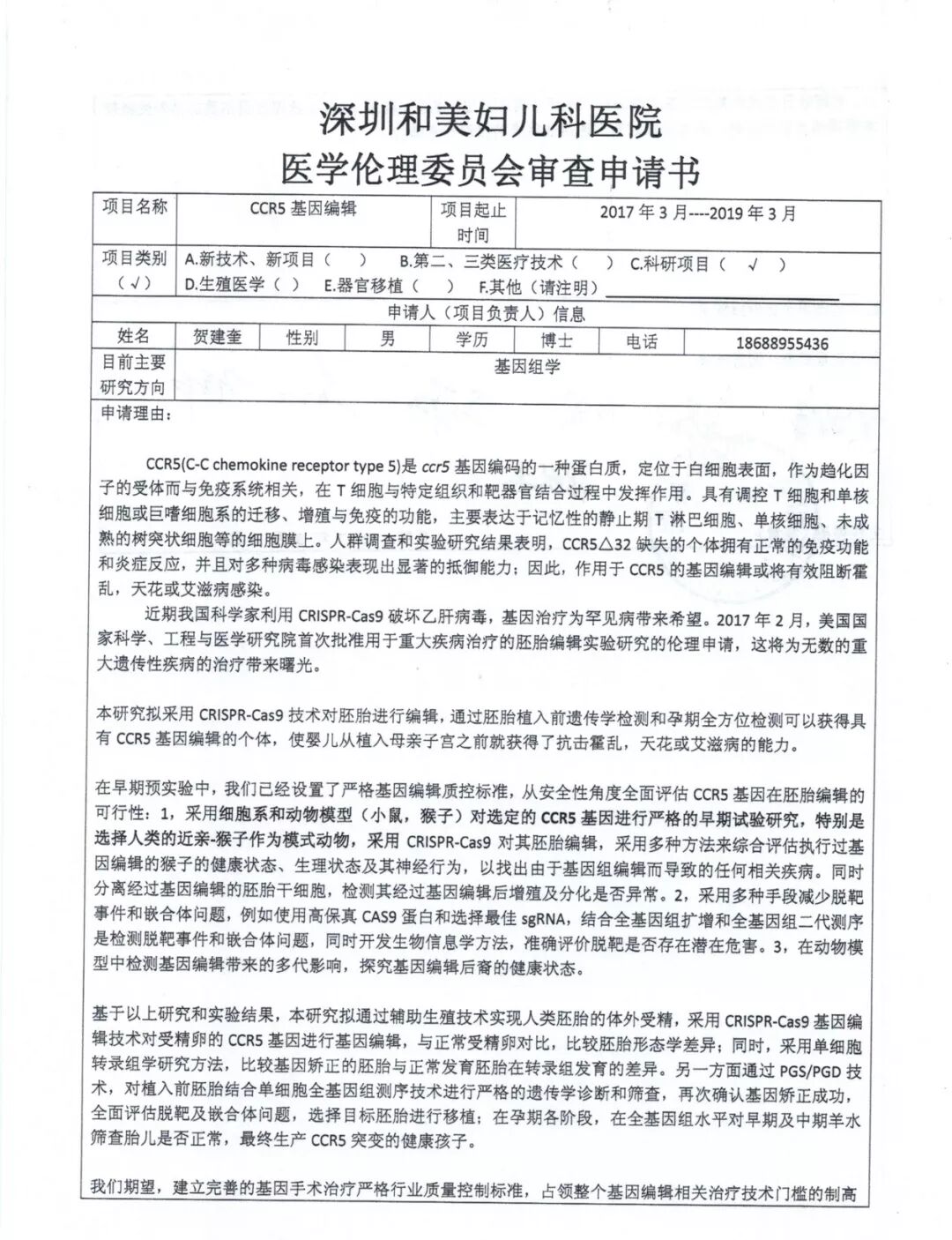 南都记者刚刚了解到,上个月刚刚从深圳和美妇儿科医院离职的医务部主任秦苏骥介绍,根据申请书显示的时间,其当时还在医院任职,同时他也是伦理委员会成员,但是他并没有印象,医院开过这个会议。作为伦理委员会成员,他的签名没有在申请书上。