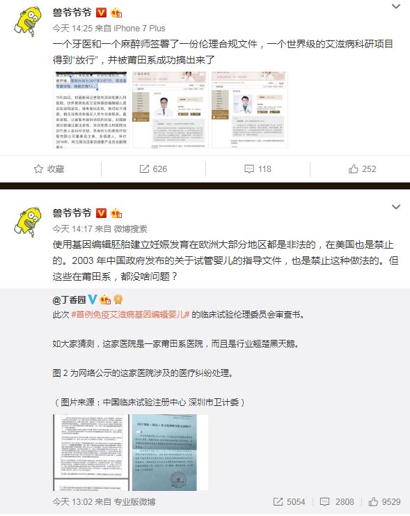 知名财经博主“兽爷”扒了相关医师简历后更在个人微博吐槽此事:“一个牙医和一个麻醉师签署了一份伦理合规文件,一个世界级的艾滋病科研项目得到“放行”,并被莆田系成功搞出来了。”